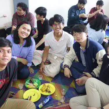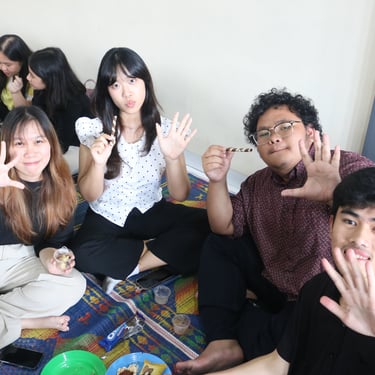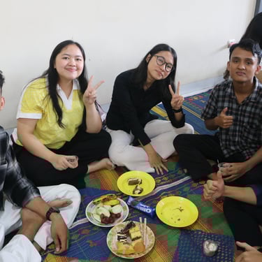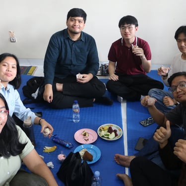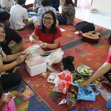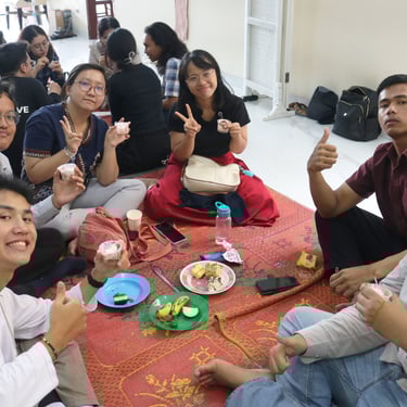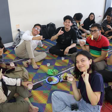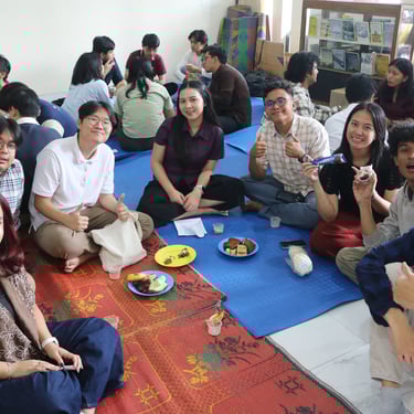 Selepas merenungkan firman Tuhan, kami diberi kesempatan melakukan journaling untuk mengingat kelimpahan-kelimpahan di 2025 serta kehadiran Tuhan di dalamnya. Melakukan hal ini merupakan salah satu praktik “Gratitude”. Tidak itu saja, kami pun mempraktikkannya lewat sesi mempersembahkan “gift”per komponen, dalam bentuk penampilan talenta (seperti menyanyi, menari, berpuisi, drama) dan berbagi makanan ringan. Ternyata semua komponen menampilkan nyanyian, tapi lagunya tidak sama 🙂. Mendengarkan setiap komponen bernyanyi membuat kami bisa melihat pekerjaan dan penyertaan Tuhan di balik semua program kerja dan aktivitas di tiap ladang pelayanan. Puji Tuhan! Tiba di bagian akhir acara, yaitu berbagi makanan ringan, dimana tiap komponen membawa makanan atau buah sesuai dengan abjad awal atau yang terkandung di dalam nama komponen (misal, PMK Open House, membawa makanan yang berawal abjad “O”). Makanan sore itu sangat melimpah, menyatakan syukur yang melimpah dari tiap komponen untuk dinikmati bersama di tengah keluarga Perkantas Jabar. Kami makan di dalam kelompok-kelompok sambil berbagi cerita.