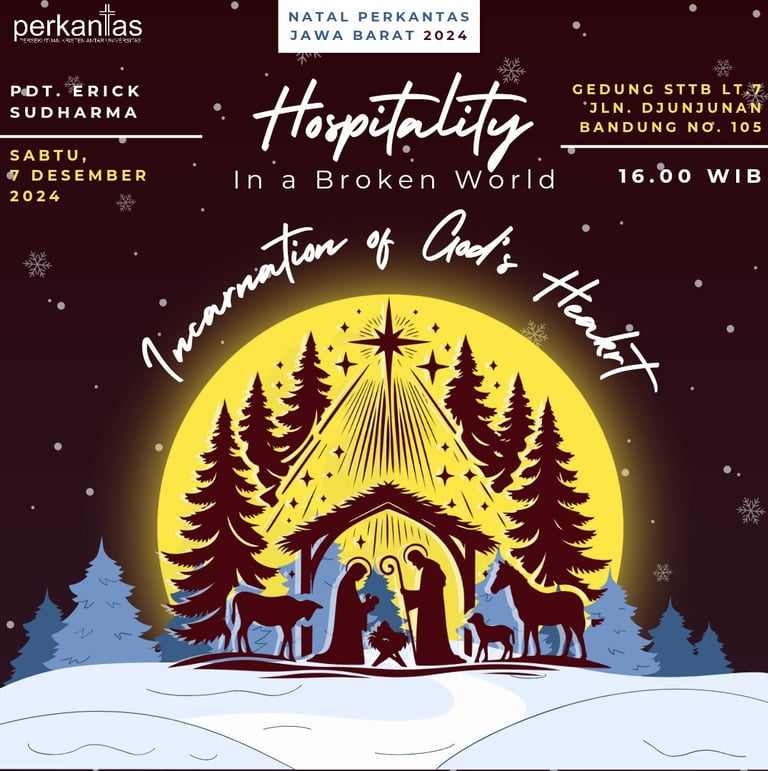 Mari bersama mewujudnyatakan praktik konkrit kasih Kristus dalam Natal Perkantas Jawa Barat 2024 dengan tema "Hospitality in a Broken World: Incarnation of God's Heart" yang akan diadakan pada: