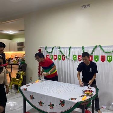 Sebagai penutup sesi permainan, seluruh peserta berkumpul di depan meja dengan lilin-lilin yang berjajar rapi. Tantangannya? Meniup lilin hanya dengan mengucapkan Merry Christmas! Hasilnya? Ada yang sukses dengan satu hembusan, ada juga yang harus berusaha keras sampai tertawa-tawa karena lilinnya tetap menyala!